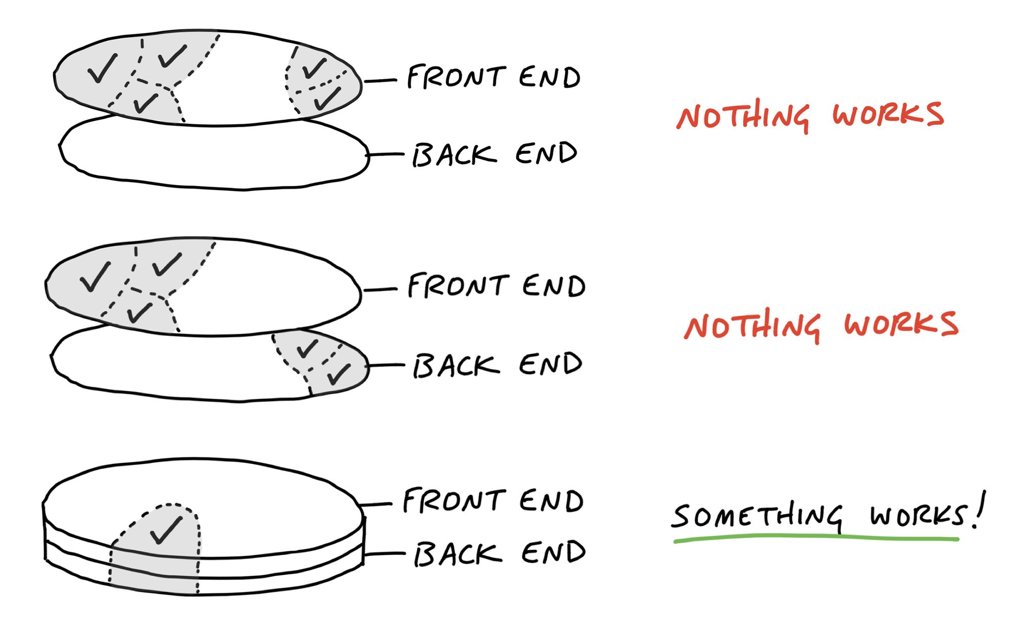 - Program just enough for the next step – On the back end, you don’t need to build everything, implementing a couple of fields or a bit of routing logic is fine, just enough to allow the front end of the slice to function.