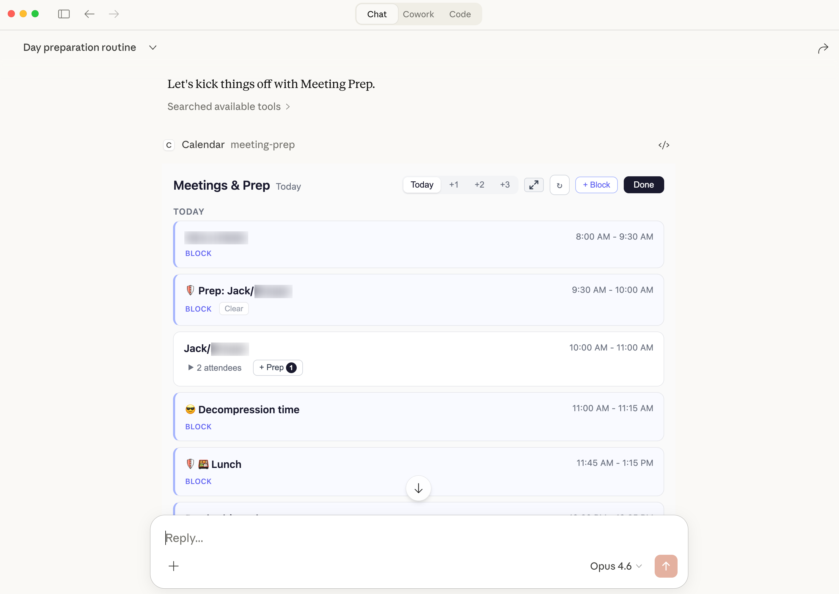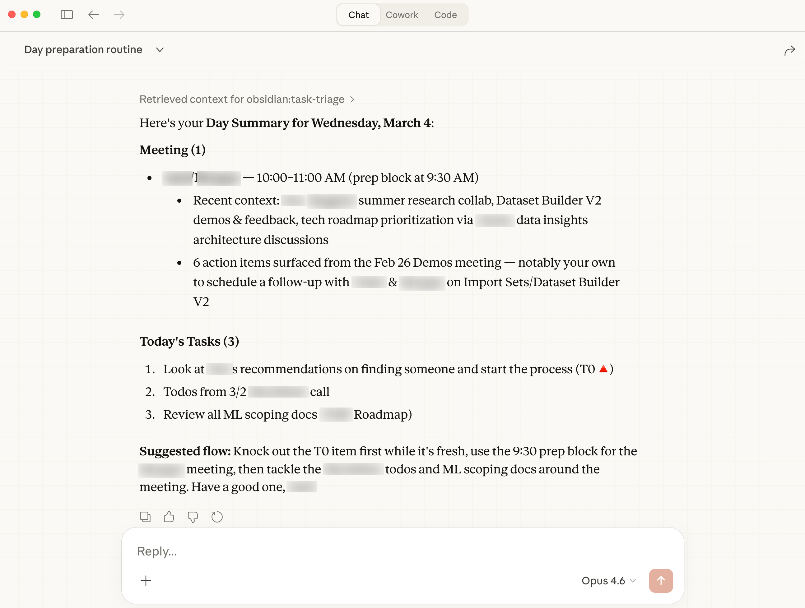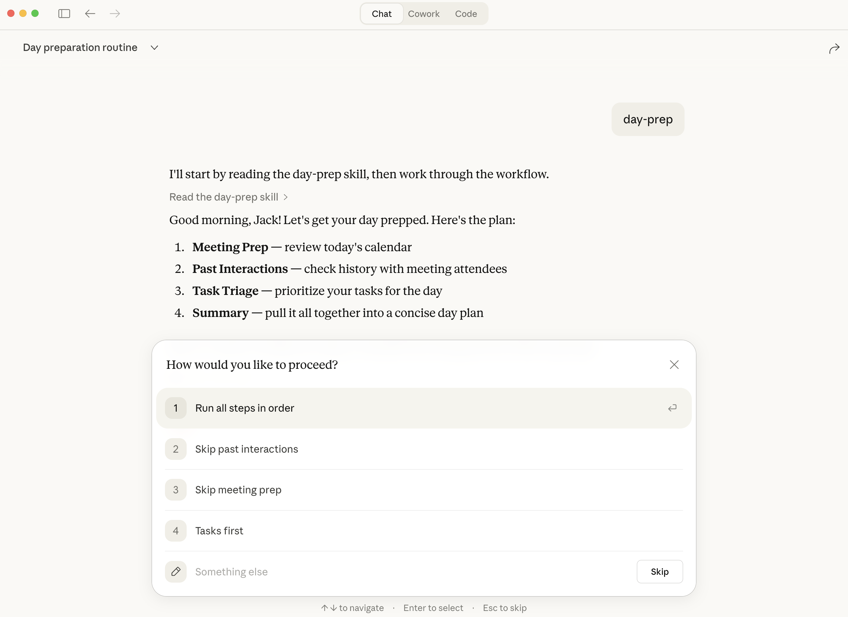 When the day-prep skill kicks in, here’s the model interacting with us:
