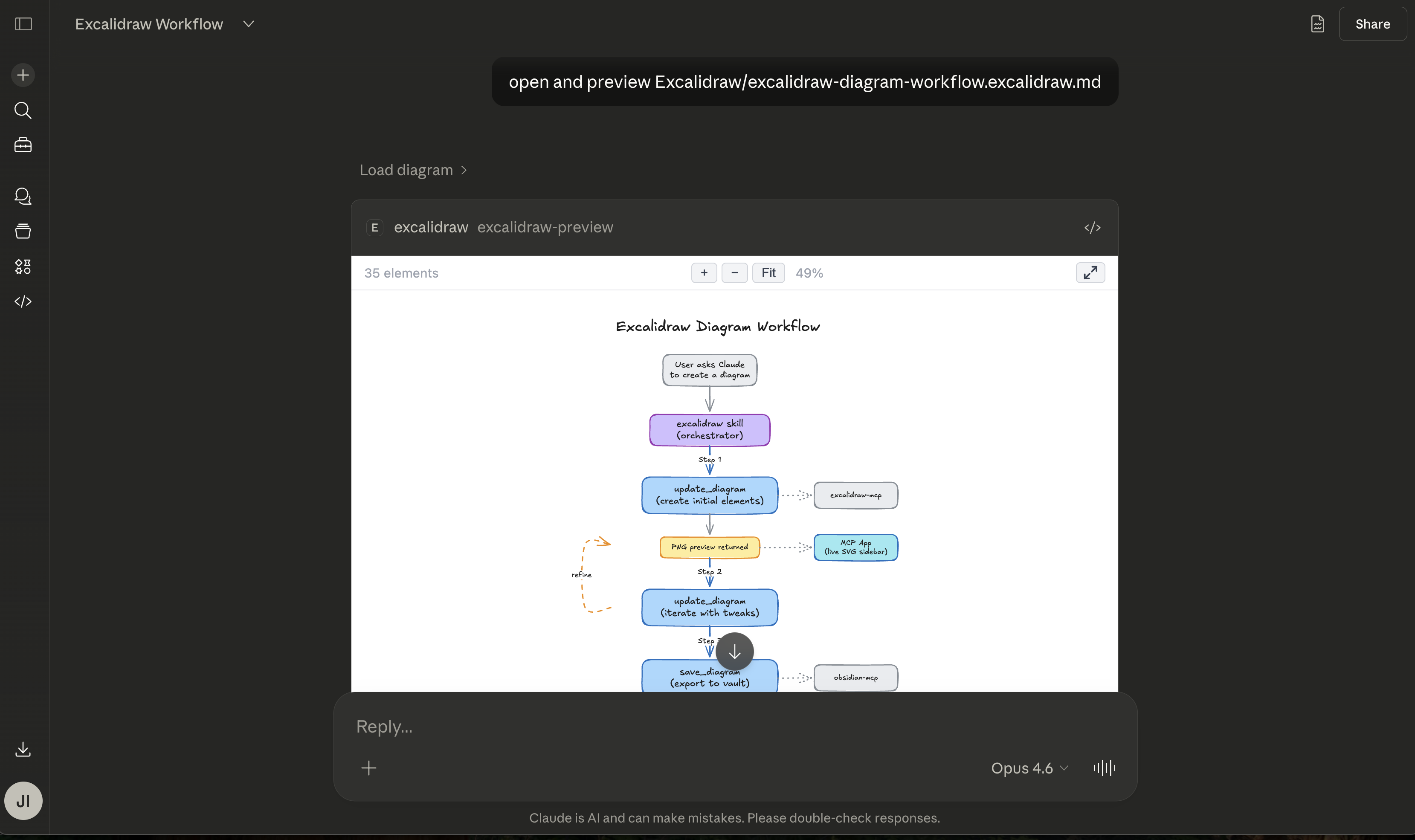 - Give Claude the tools needed to create, edit, load, and save Excalidraw diagrams hosted in Obsidian