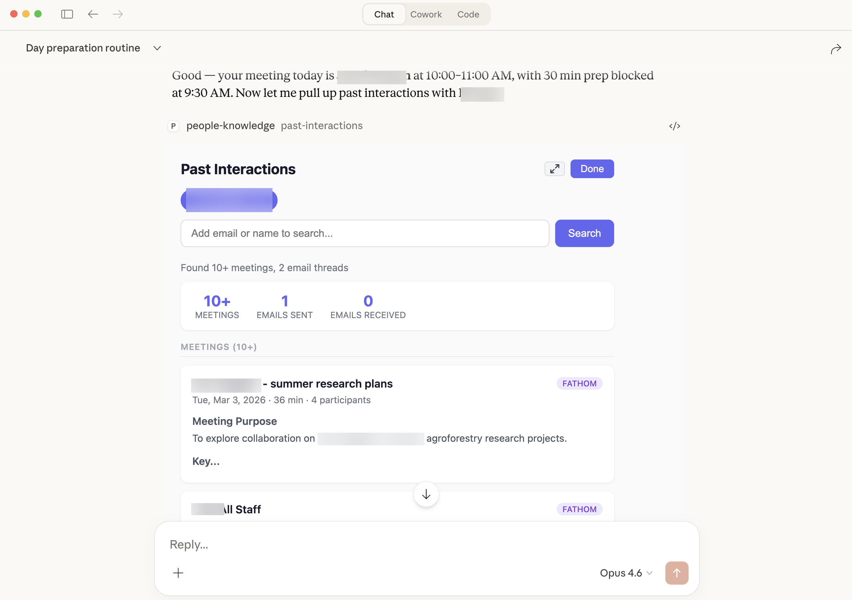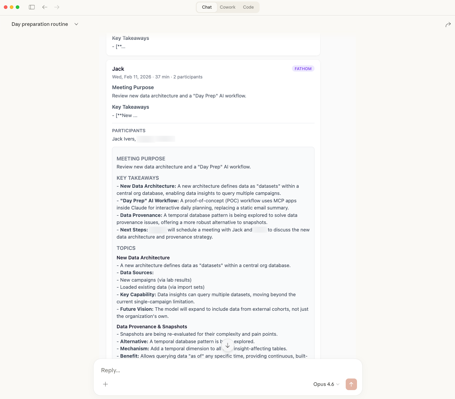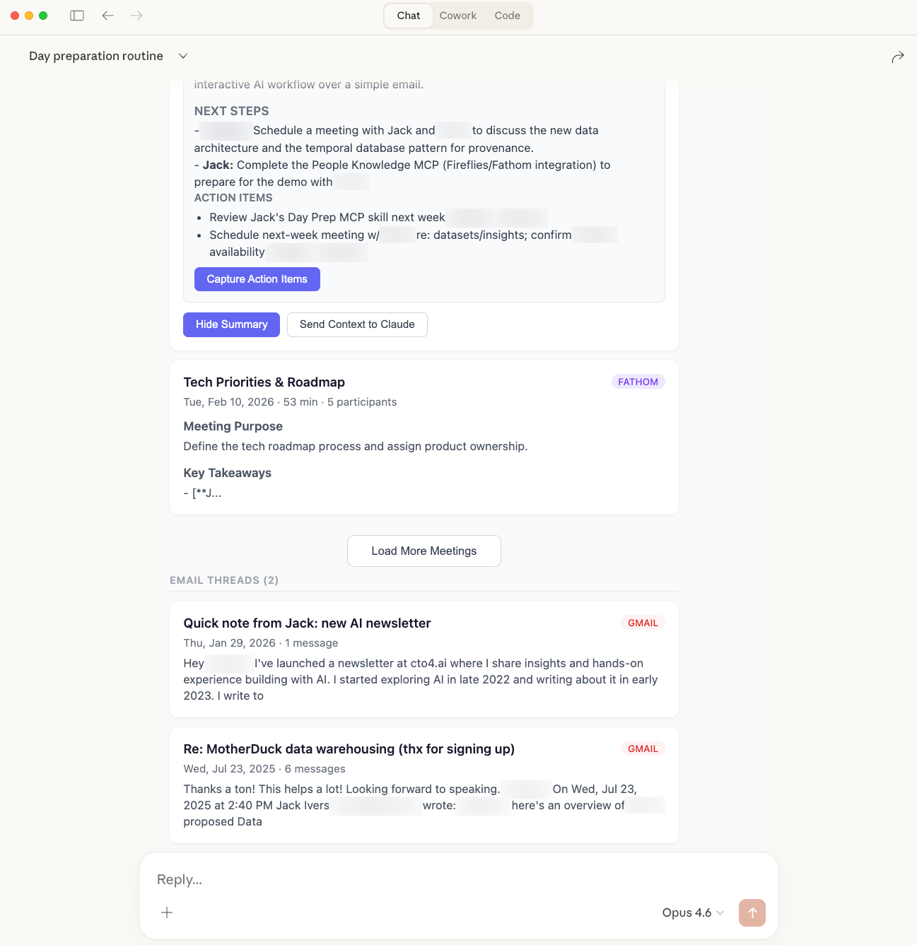 Behind the scenes, Meeting Prep uses the MCP App updateModelContext method to hand Claude the emails of participants in my upcoming meetings, necessary data for the next step of the orchestrated Day Prep workflow.