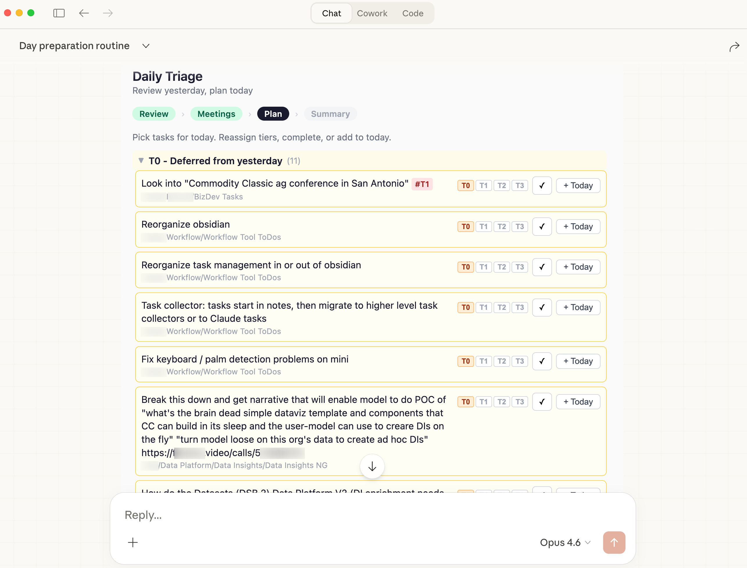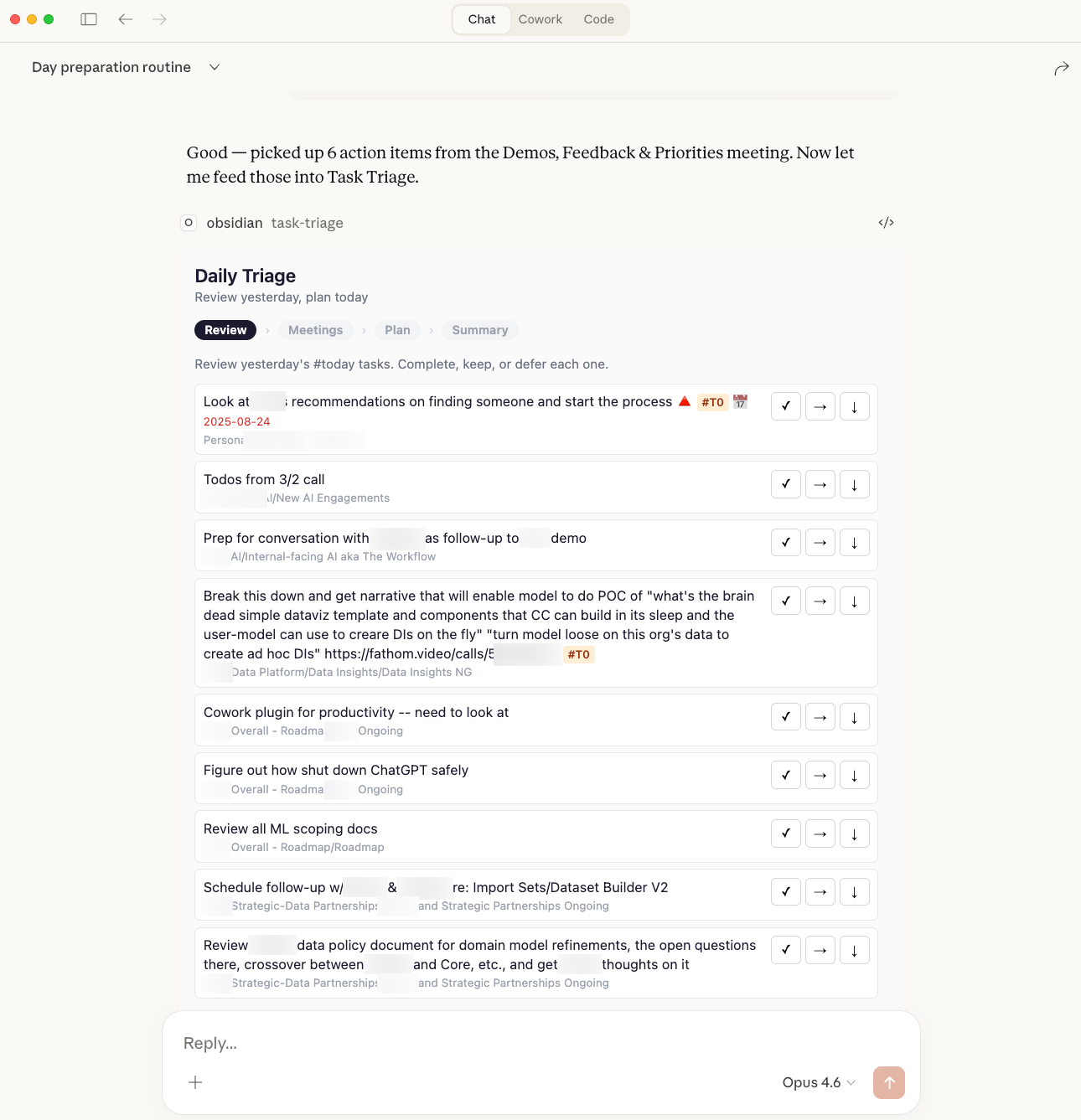 I use Obsidian with the Task plugin to manage my tasks. The Task Triage app is actually a 3-step mini-flow within the larger Day Prep flow: