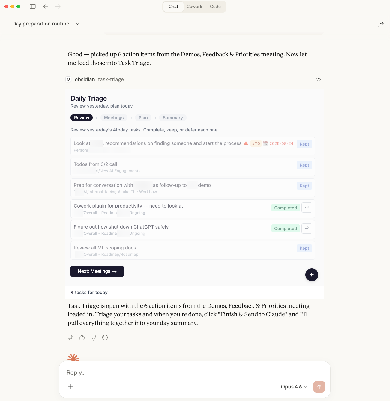 Once I’ve finished reviewing past interactions, the model loads up Task Triage, passing in any action items I captured in the previous step.