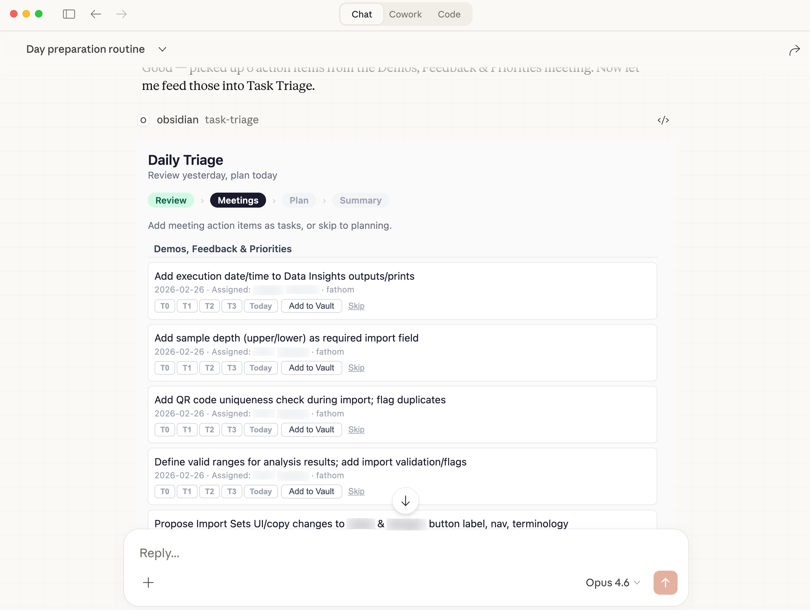 | Obsidian | Task Triage | Feb 3 — task dashboard | Still evolving (Meeting Todos added Mar 2) |