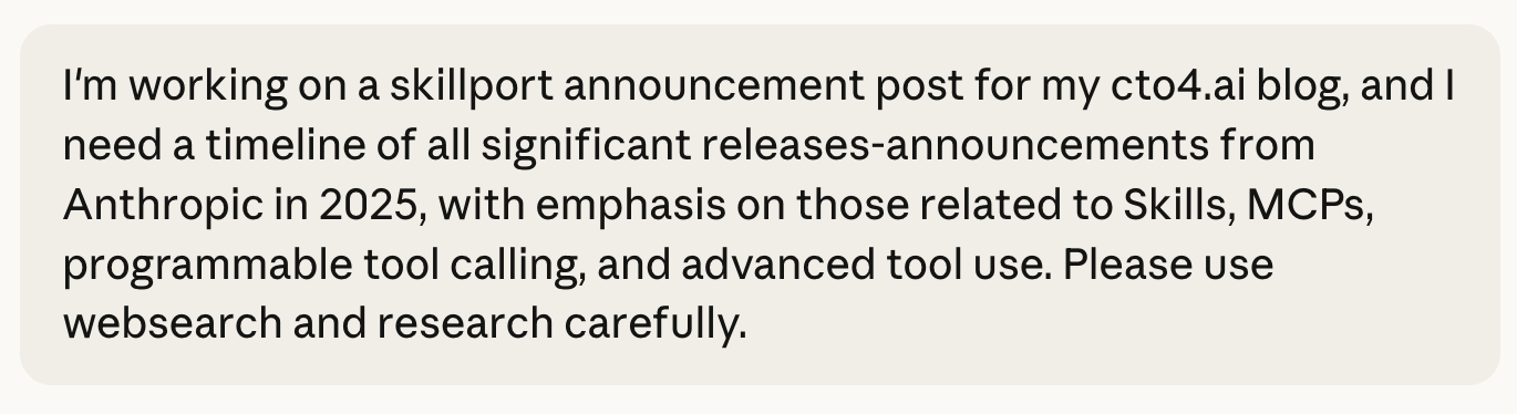 On the context efficiency and performance fronts, November was a big month: possibly spurred by Cloudflare’s “Code Mode” research, Anthropic began recommending and supporting a radically context-efficient and performant mode of model-to-MCP interaction, Programmatic Tool Calling. In a nutshell, instead of the model directly interacting with MCP tools, sifting and sorting their outputs, gobbling up huge chunks of context, the model instead writes code that does all that. As a result, the model no longer bears the context weight of all the intermediate tool call results, and no longer incurs the performance penalties of long, chatty conversations with tools. Anything that improves MCPs and tool calling is a big win for Skills++.