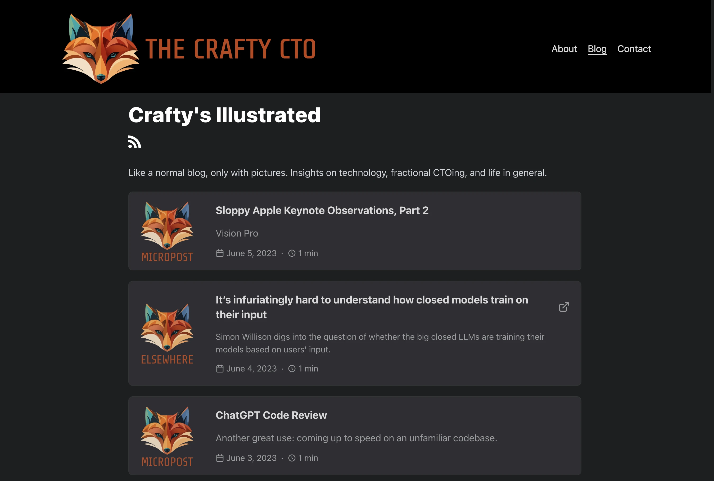 I’ve mentioned that generative AI tools like ChatGPT and MidJourney allow me to be more ambitious with my projects than I would otherwise have been. I would have hesitated if I had to devote a work week or more to enabling microblogging, but ChatGPT GPT-4 edition cut that task down enough that I was able to complete it in spare hours over the holiday weekend. I liked Simon Willison’s approach of having several flavors of micro content, and ended up implementing four: